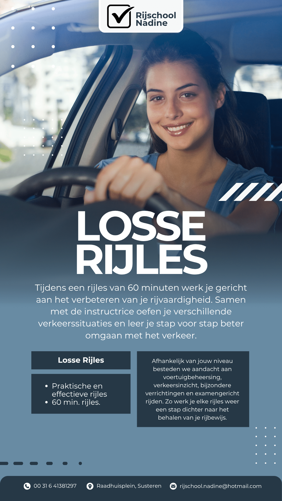 Tijdens een rijles van 50 minuten werk je gericht aan het verbeteren van je rijvaardigheid. Samen met de instructrice oefen je verschillende verkeerssituaties en leer je stap voor stap beter omgaan met het verkeer.