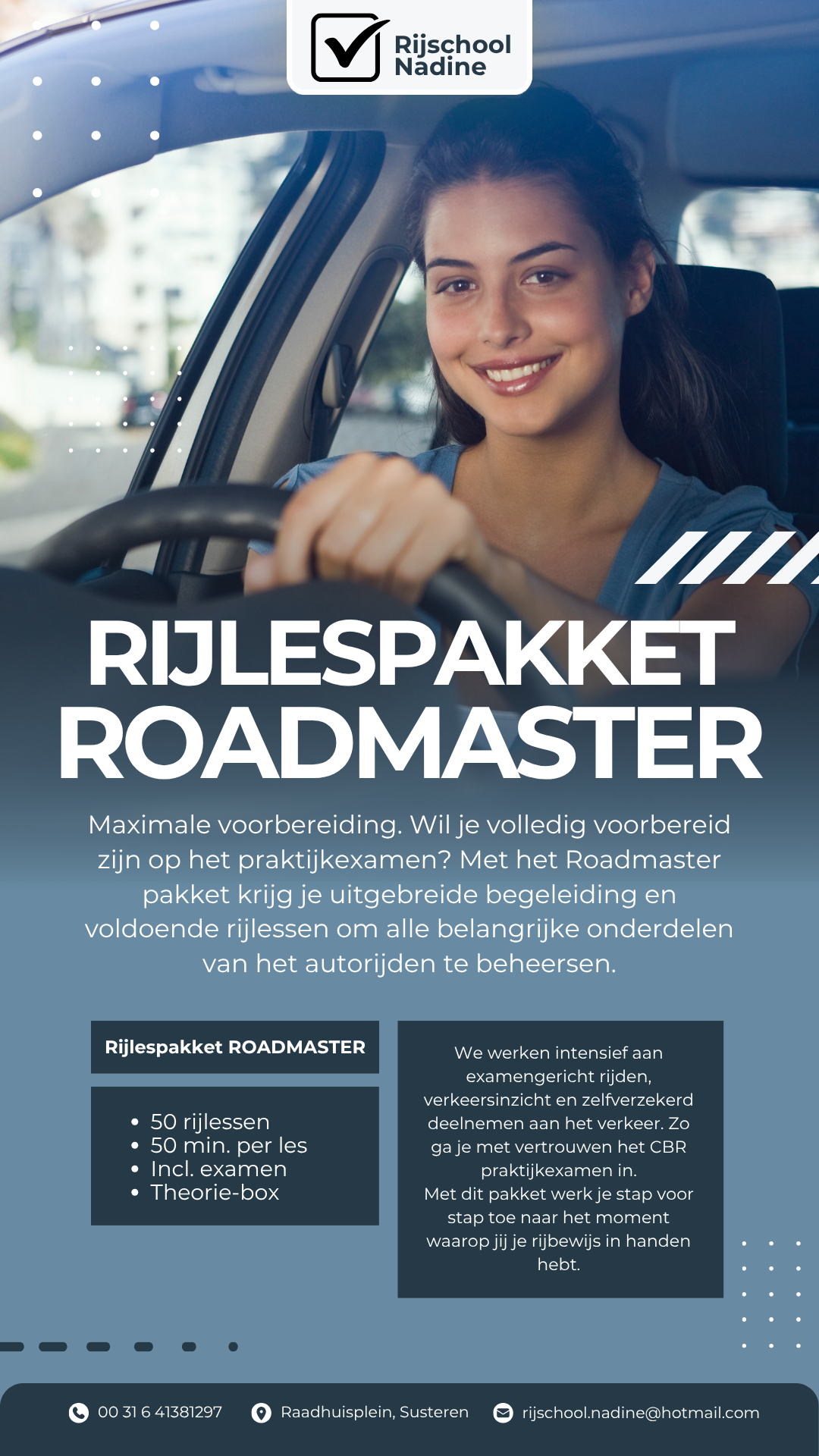 Wil je volledig voorbereid zijn op het praktijkexamen? Met het Roadmaster pakket krijg je uitgebreide begeleiding en voldoende rijlessen om alle belangrijke onderdelen van het autorijden te beheersen.